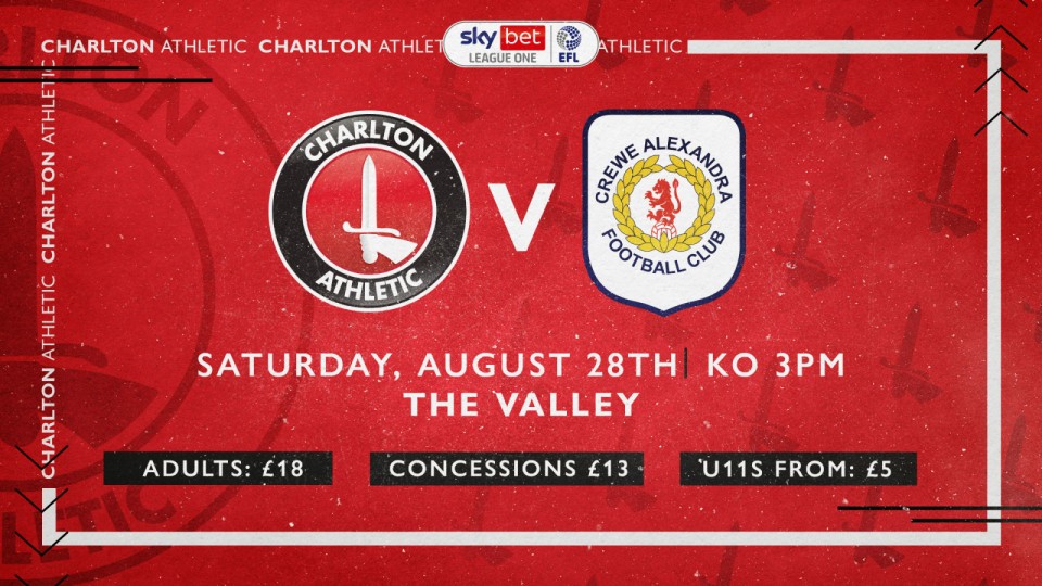 Tickets for Charlton’s League One clash against Crewe Alexandra at The Valley on Saturday, August 28th (3pm) are now on sale.