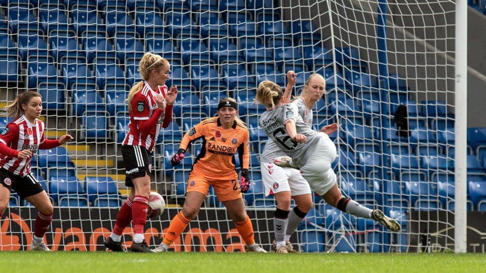 Charlton had a brilliant chance to open the scoring through Megan Wynne in the 17th minute. Hannah Godfrey looped a ball over the top, forcing Kitching to come off her line. The goalkeeper misjudged the flight of the ball and Wynne was through on goal, but a superb last-ditch tackle by a Sheffield United player forced it out for a corner.