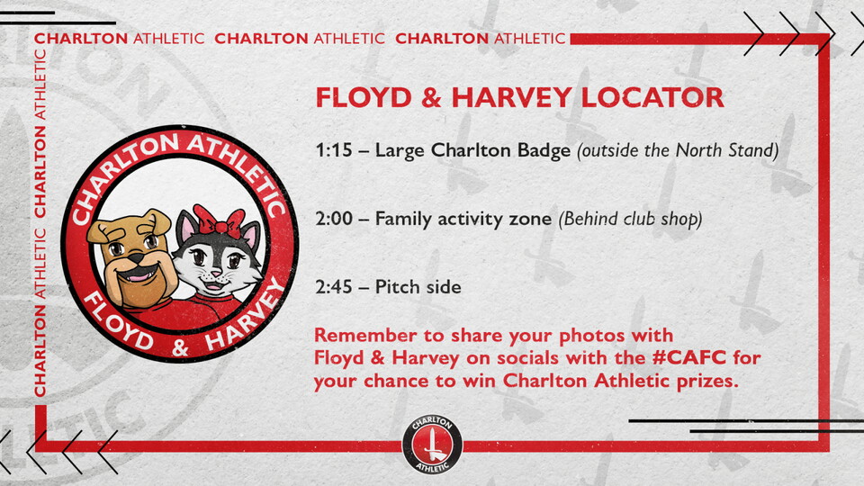 Supporters will be able to meet them by the large Charlton badge outside the Covered End at 1.15pm and Floyd and Harvey will head pitchside at 2.45pm.