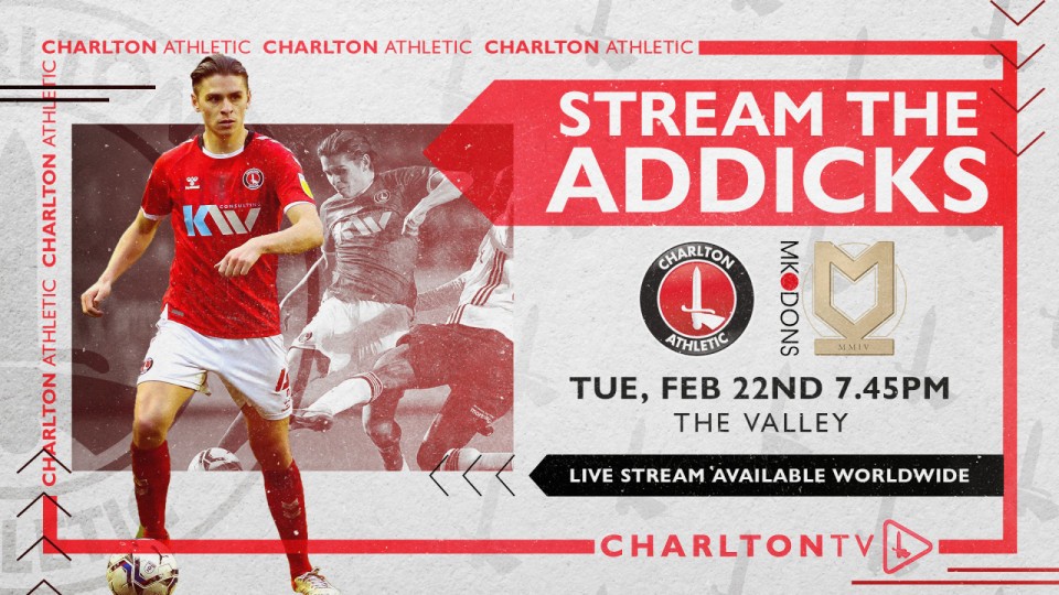 Supporters all over the world will be able to watch Tuesday’s Sky Bet League One clash against MK Dons live on CharltonTV (7.45pm GMT KO).