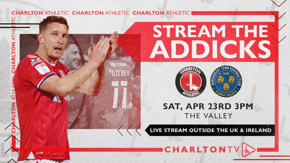 Supporters based outside of the UK* & Ireland can watch every kick of Saturday’s clash against Shrewsbury Town live on CharltonTV (3pm BST kick-off).