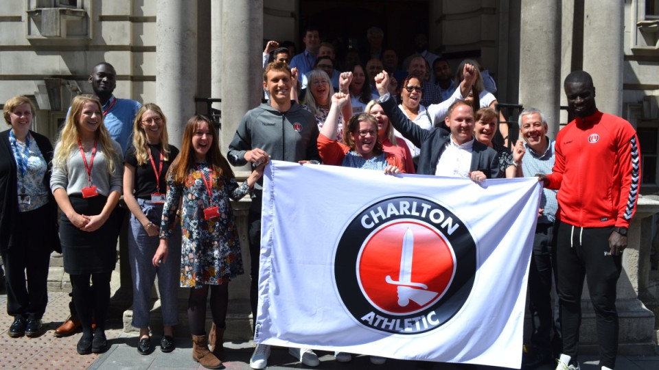 Ahead of Charlton’s play-off final date at Wembley, Charlton players Naby Sarr and Krystian Bielik made a trip to Woolwich Town Hall to raise the Charlton flag.